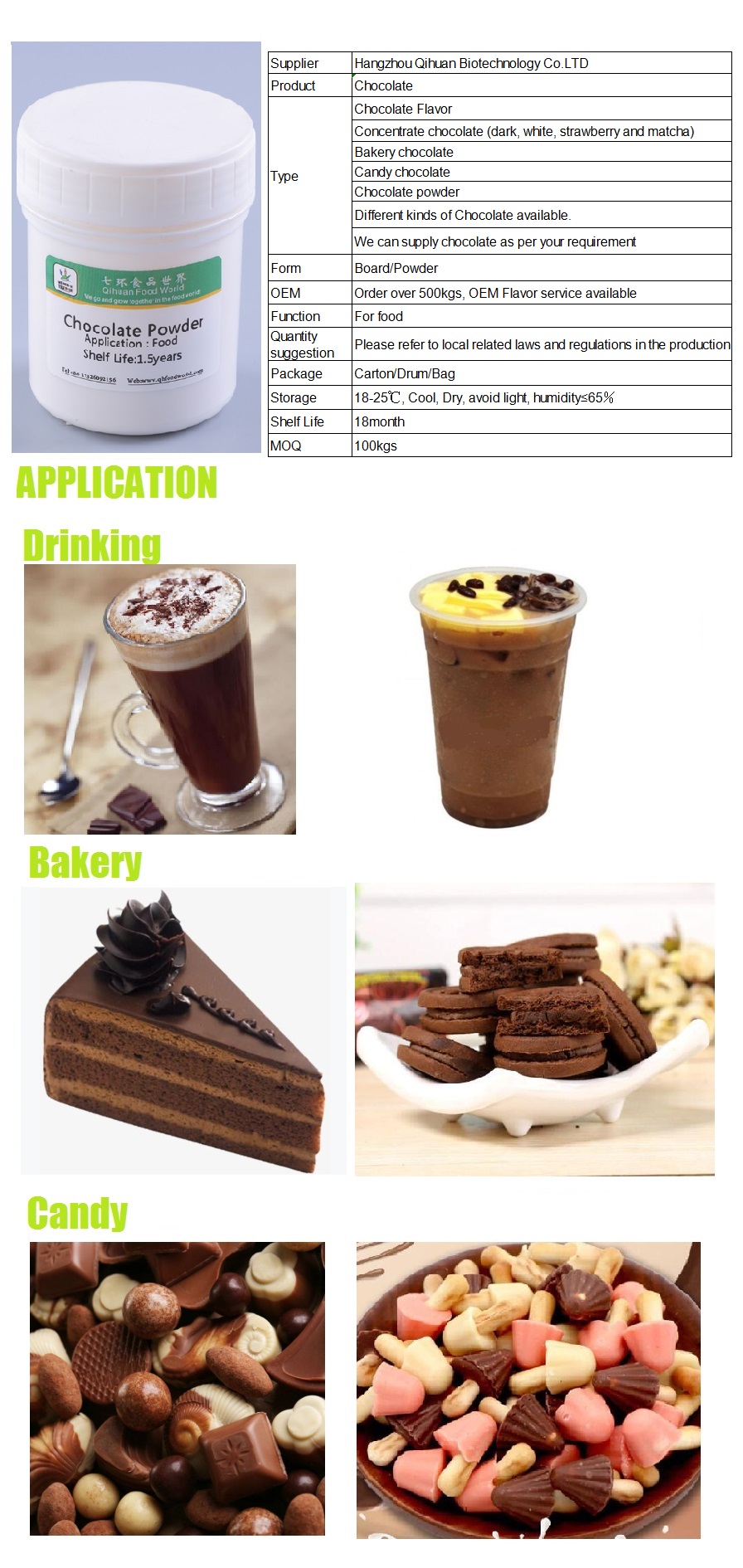 We supply chocolate flavor, chocolate powder, bakery chocolate, candy chocolate, concentrated Chocolate include dark chocolate, white chocolate, strawberry chocolate, lemon chocolate and matcha chocolate,